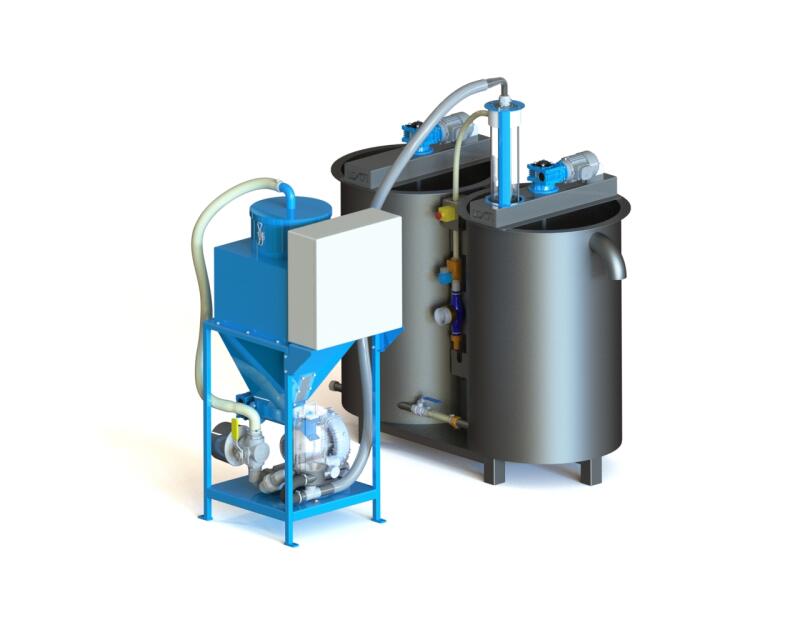 Med hjälp av en tryckgivare mäts nivån i blandningskärlet och vid bestämd nivå initieras tillförsel av granulat och vatten. Detta sker med korta intervaller i så kallad batchvis-kontinuerlig dosering. Genom att utnyttja hela tankarnas lagringsvolym vid dosering kombinerat med en effektiv omrörning erhålls en homogen lösning med önskad koncentration och mognadstid.